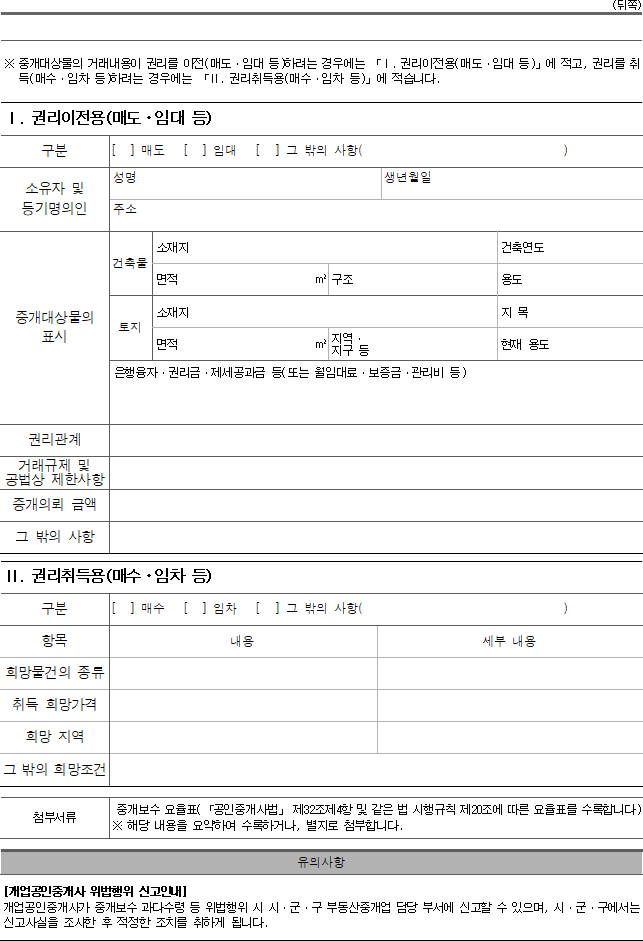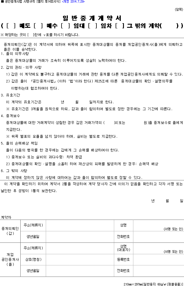 제30회 기출문제 공인중개사법 19번 1번 2번 3번 4번 5번 6번 7번 8번 9번 10번 11번 12번 13번 14번 15번 16번 17번 18번 19번 20번 21번 22번 23번 24번 25번 26번 27번 28번 29번 30번 31번 32번 33번 34번 35번 36번 37번 38번 39번 40번 18번 | 19번 | 20번 본문 19. 무주택자인 甲이 주택을 물색하여 매수하기 위해 개업공인중개사인 乙과 일반중개계약을 체결하고자 한다. 이 경우 공인중개사법령상 표준서식인 일반중개계약서에 기재하는 항목을 모두 고른 것은? ㄱ.소유자 및 등기명의인 ㄴ.희망 지역 ㄷ.취득 희망가격 ㄹ.거래규제 및 공법상 제한사항 ① ㄷ ② ㄱ, ㄴ ③ ㄴ, ㄷ ④ ㄷ, ㄹ ⑤ ㄱ, ㄴ, ㄷ 정답체크 1번 2번 3번 4번 5번 확인 해설보기 ③ ㄴ: 희망 지역, ㄷ: 취득 희망가격번호구분내용 1조문 2판례 3솔루션